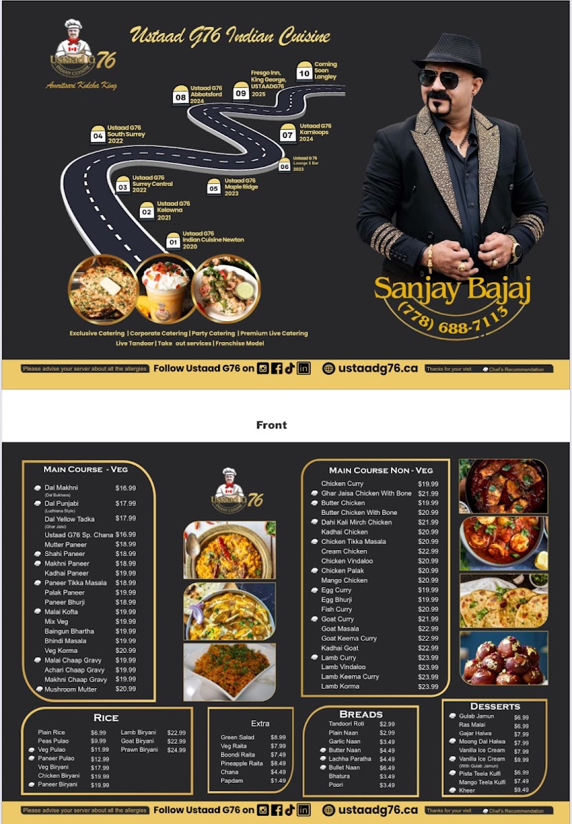 Welcome to Ustaad G76 MAPLE RIDGE, a culinary gem nestled in Maple Ridge, BC. This vibrant restaurant is celebrated for its mouthwatering offerings that blend authentic flavors and modern dining experiences. With a diverse menu featuring delectable vegetarian dishes like Pav Bhaji, Amritsari Kulcha, and generous Veg Thalis, it's clear that every meal is crafted with care.